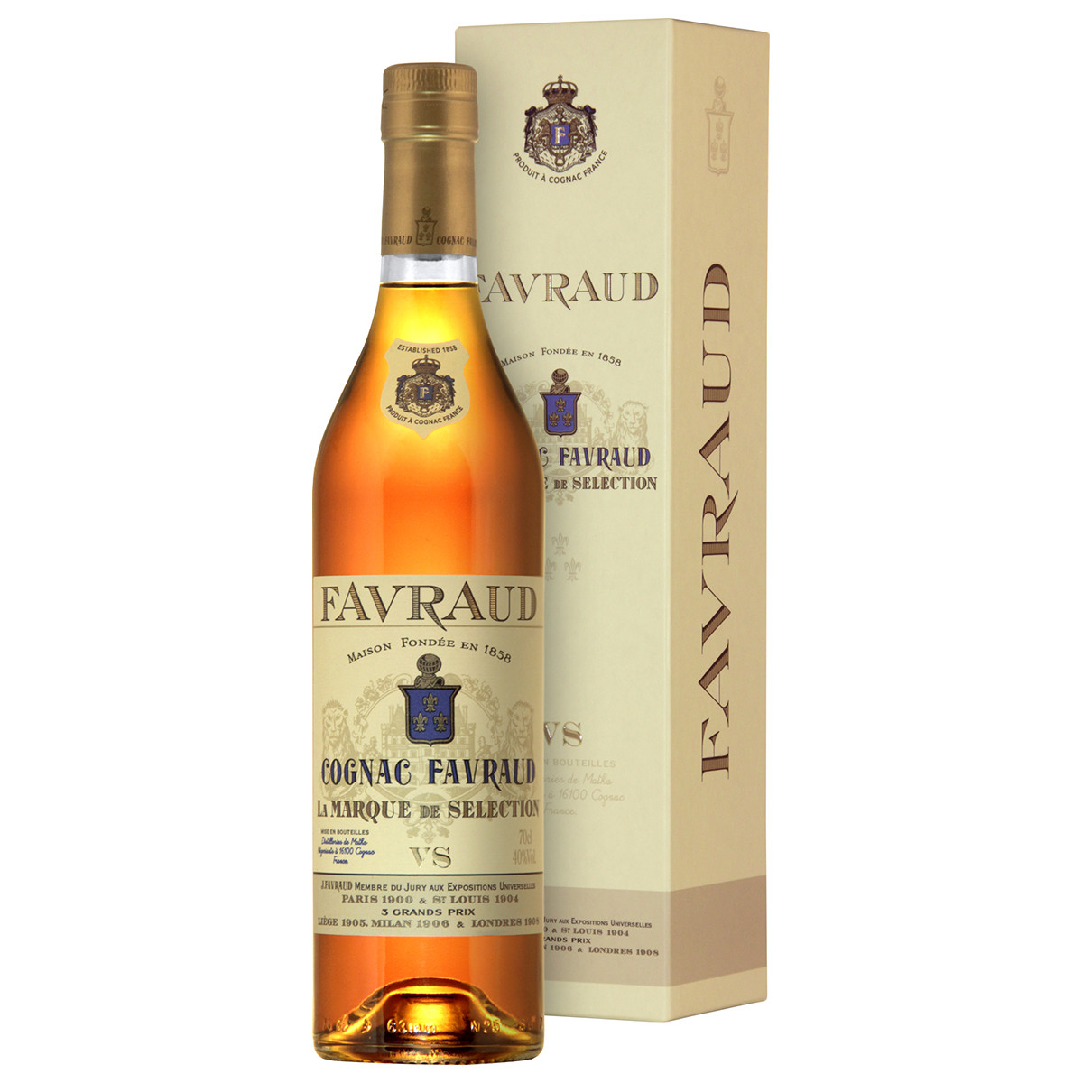Коньяк от дома Фавро, основанного в 1858 году, изготовлен из спиртов Гранд Шампань, Птит Шампань и Фэн Буа среднего возраста не менее 3 лет. Обладает насыщенным выразительным янтарным цветом. В аромате тона сухофруктов и цитрусовых с легкими цветочными нотами. Вкус сбалансированный и округлый.