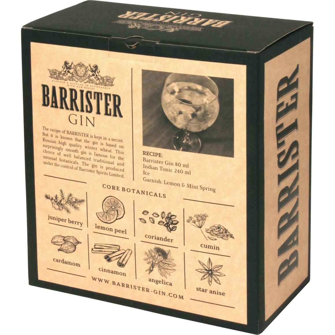 Barrister Orange изготовлен уникальным процессом дистилляции ароматических спиртов, что позволяет получить неповторимый вкус спелых апельсинов в джине. Благодаря крепости 43%, ароматические спирты позволяют создавать коктейли с интенсивным ароматом цитрусовых и специй. Созданный специально для коктейлей, прекрасно подходит для употребления в чистом виде. Для производства используются только натуральные ингредиенты: можжевельник, апельсин, кардамон, кориандр, анис, корица. Продукт имеет сертификат Кашрута. Попробуйте Барристер Оранж в коктейле Джин Тоник: