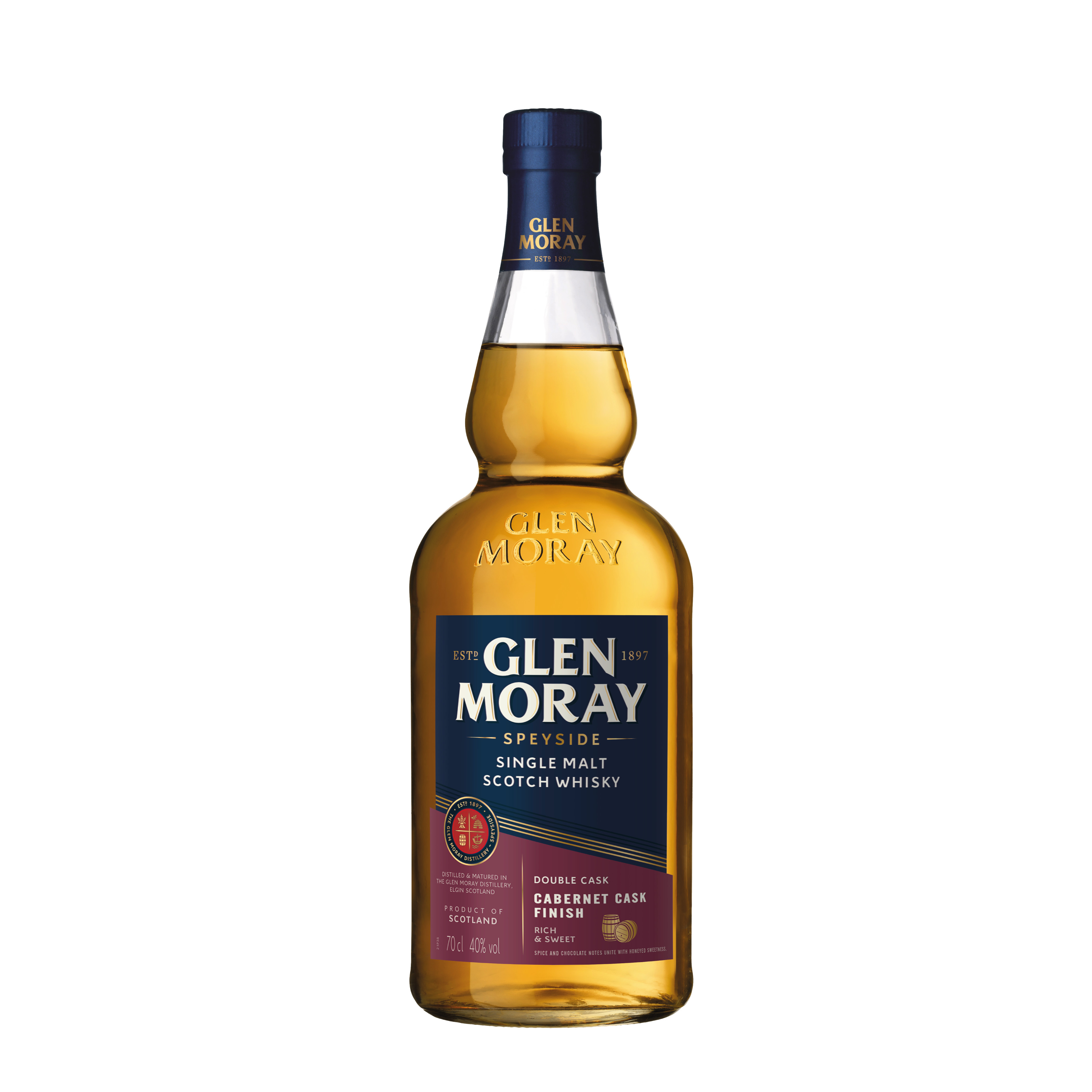 Glen Moray Classic Cabernet cask finish. Редкий пример довыдержки солодового виски в бочках из-под красного вина из сорта Каберне Совиньон, выращенного во французском регионе Бордо. Идеальный виски для тех, кто ищет новые вкусы или хочет понять, как винные бочки влияют на шотландский виски. В основе этого релиза солодовые спирты, выдержанные в отборных бочках из-под бурбона от трех до девяти лет. Средний их возраст — 6 лет. После чего виски был 14 месяцев финиширован в бочках французского дуба из-под бордоского красного вина из сорта Каберне Совиньон. Серия "Elgin Classic" ("Классика Элгина") включает доступные по цене виски разных стилей, но неизменно сохраняющие фирменный фруктовый характер Glen Moray. Cabernet Cask Finish — самое свежее дополнение к серии. Идеальный виски для тех, кто ищет новые вкусы или хочет понять, как винные бочки влияют на шотландский виски. С этим релизом особенно интересно знакомиться, сравнивая его с Glen Moray Chardonnay Cask Finish.