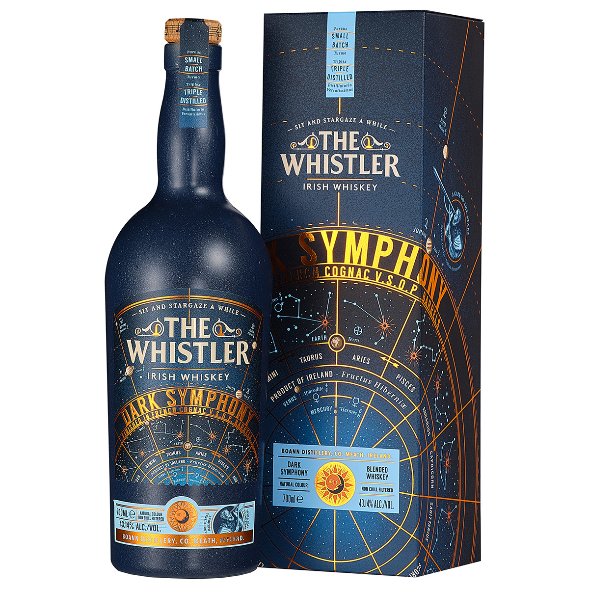 The Whistler Dark Symphony открывает новую вселенную релизов виски Whistler. Ирландский виски с глубоким вкусовым профилем благодаря финишу в N.E.O.C (New Era Oak Cask) бочках из-под французского коньяка V.S.O.P. Технология N.E.O.C — это реставрация бочек при которой вручную срезается верхний слой со стенок, и аккуратно, с тщательным контролем пламени, проходит переобжиг, даруя бочке «второе дыхание», при этом сохраняя максимум вкуса оставшегося от коньяка, который будет отдан виски залитым на довыдержку. Ирландский Виски. Тройная перегонка. В составе 20% односолодовых 80% зерновых спиртов. Выдерживается 3-4 года в бочках из-под бурбона, а затем финишируется 12 месяцев в бочках N.E.O.C. из-под французского коньяка категории V.S.O.P. В нестандартную крепость этого релиза зашифровано число Пи, поэтому вместо 40%об. в нем 43.14%об.