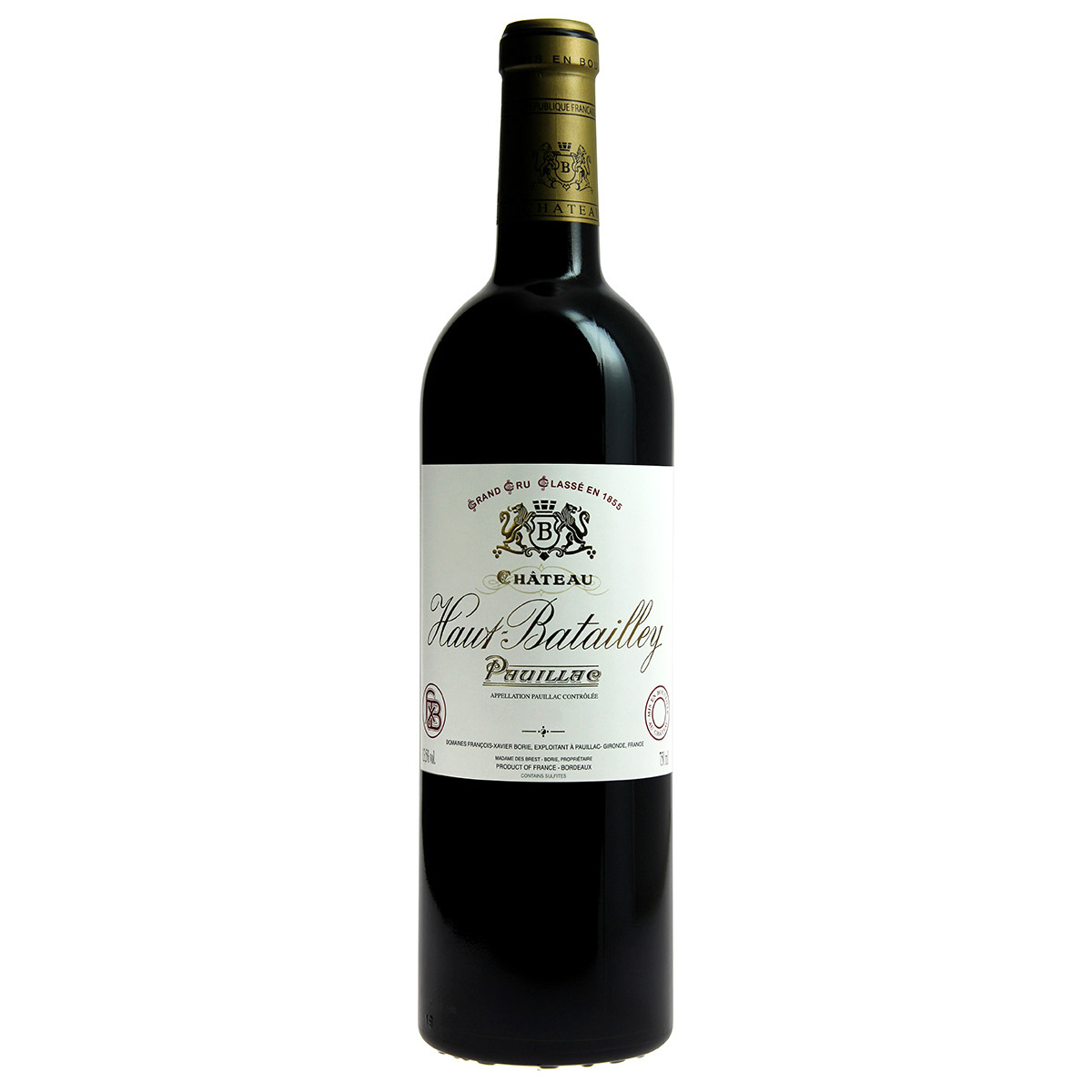 "Название Шато происходит от битвы (bataille), которая состоялась в ходе Столетней войны в 1453 году между французами и англичанами на поле, где сейчас располагается поместье. Шато О-Батайе находится к юго-западу апелласьона Пойяк. 22 га виноградников расположены на гравийных почвах.¶ПРОИЗВОДСТВО¶Выдержано в дубовых бочках (60% новых).¶ЦВЕТ, АРОМАТ И ВКУС¶Рубиновый цвет.¶