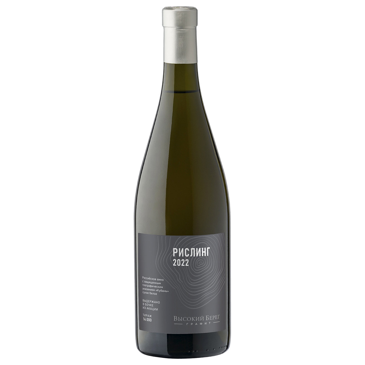 «Серия лимитированных вин «Графит» от бренда «Высокий Берег» воплощает лучшие эксперименты виноделов с применением новых методик и использованием европейских сортов винограда, выращенного в России. Линейка была открыта в 2019 году тиражным выпуском двух исключительных вин сортов Рислинг Рейнский и Мерло, выдержанных в деревянных бочках из уникальных пород акации и дуба. Своё продолжение серия воплотила в выпуске розового вина урожая 2022 года в лучших традициях французского стиля Прованс. Российское вино с ЗГУ «Кубань» выдержанное сухое белое «Высокий Берег Рислинг. Графит» изготовлено из одноименного сорта винограда урожая 2022 года. Первичная ферментация выполнена с помощью настоя сусла на мезге в прессах с предварительным охлаждением и последующим брожением при контролируемой температуре. Вино выдержано не менее 12 месяцев в бочке из итальянской акации.