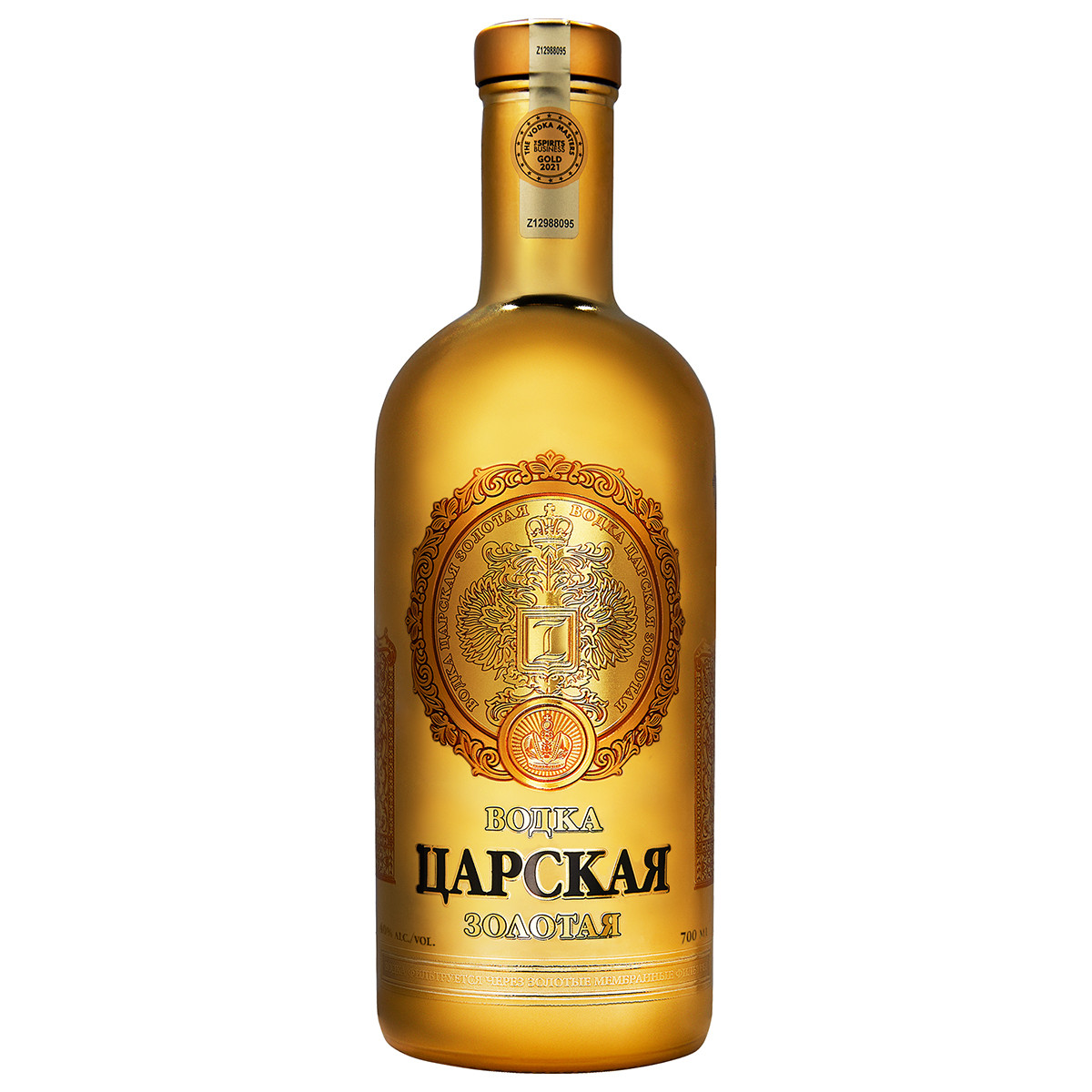 Водка Царская Золотая  – напиток класса premium. Водка Царская Золотая приготовлена по рецепту петровских времен: на меду, с настоем липового цвета. При создании водки Царская Золотая используется спирт Люкс и чистая вода из Ладожского озера. Процесс очистки включает в себя прохождение продукта через систему специальных мембранных фильтров. Капля за каплей, водка Царская Золотая проходит очистку через фильтры, прошитые золотой нитью. Бутылка водки Царская Золотая декорирована золотом высшей пробы (99,9%) и изготовлена из специального аптекарского стекла, что гарантирует первозданный вкус водки на протяжении всего срока хранения. Водка Царская Золотая на youtube.com Состав водки Царская Золотая: вода питьевая исправленная, спирт ректификованный Люкс (зерновой), мед липовый натуральный, настой липового цвета. Награды и рейтинги За последние 10 лет водки Царская Золотая и Imperial Collection Gold завоевали награды множество наград престижных российских и международных дегустационных конкурсов и продовольственных выставок. В 2024 г. Царская Золотая получила право на использование знака "Золото" в конкурсе "Expert Cup"