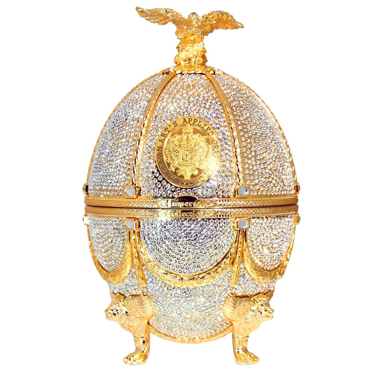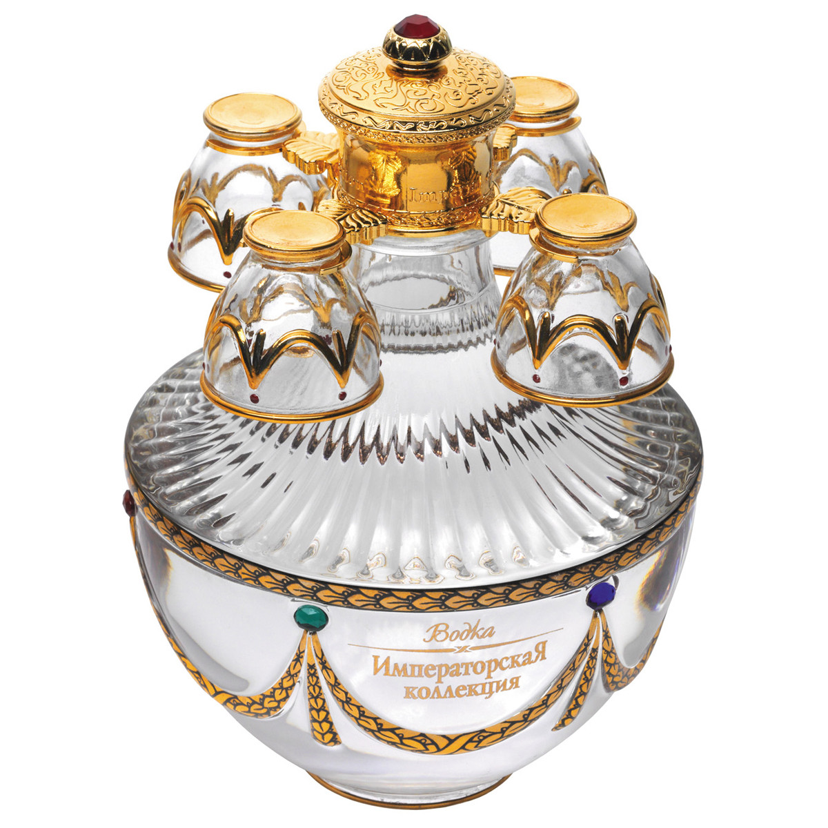 Шедевром бренда «Императорская коллекция» являются уникальные футляры в форме яиц, стилизованных под работы Карла Фаберже. Для оформления уникального футляра Диамант используется более 5000 кристаллов, вклеенных вручную. Кристаллы выполнены компанией Preciosa – известным чешским брендом класса люкс, ведущим мировым производителем стекла. Изделиями компании Preciosa, расположенной в сердце Хрустальной долины – родине чешского стекла, восхищаются в более чем 140 странах мира. Граненые хрустальные камни и бусины используются в бижутерии, знаменитые дизайнеры украшают ими одежду и модные аксессуары. На производство одного яйца Диамант уходит 5 рабочих дней, таким образом, в год может быть произведено не более 50 таких изделий. Соединив историческую традицию производства водки и эксклюзивное исполнение, мы создали не просто совершенную водку, а настоящий шедевр ручной работы. Футляр венчает орел – изящный и элегантный, разработанный одним из самых известных флорентийских мастеров, который более тридцати лет работает в Ватикане. Графины с рюмками сделаны из венецианского стекла. В подарочный набор «Императорская коллекция Super Premium» входит графин емкостью 0,7 литра с четырьмя рюмочками на кронштейне, футляр в виде пасхального яйца «Фаберже», подарочный деревянный короб, сертификат, подарочный пакет.