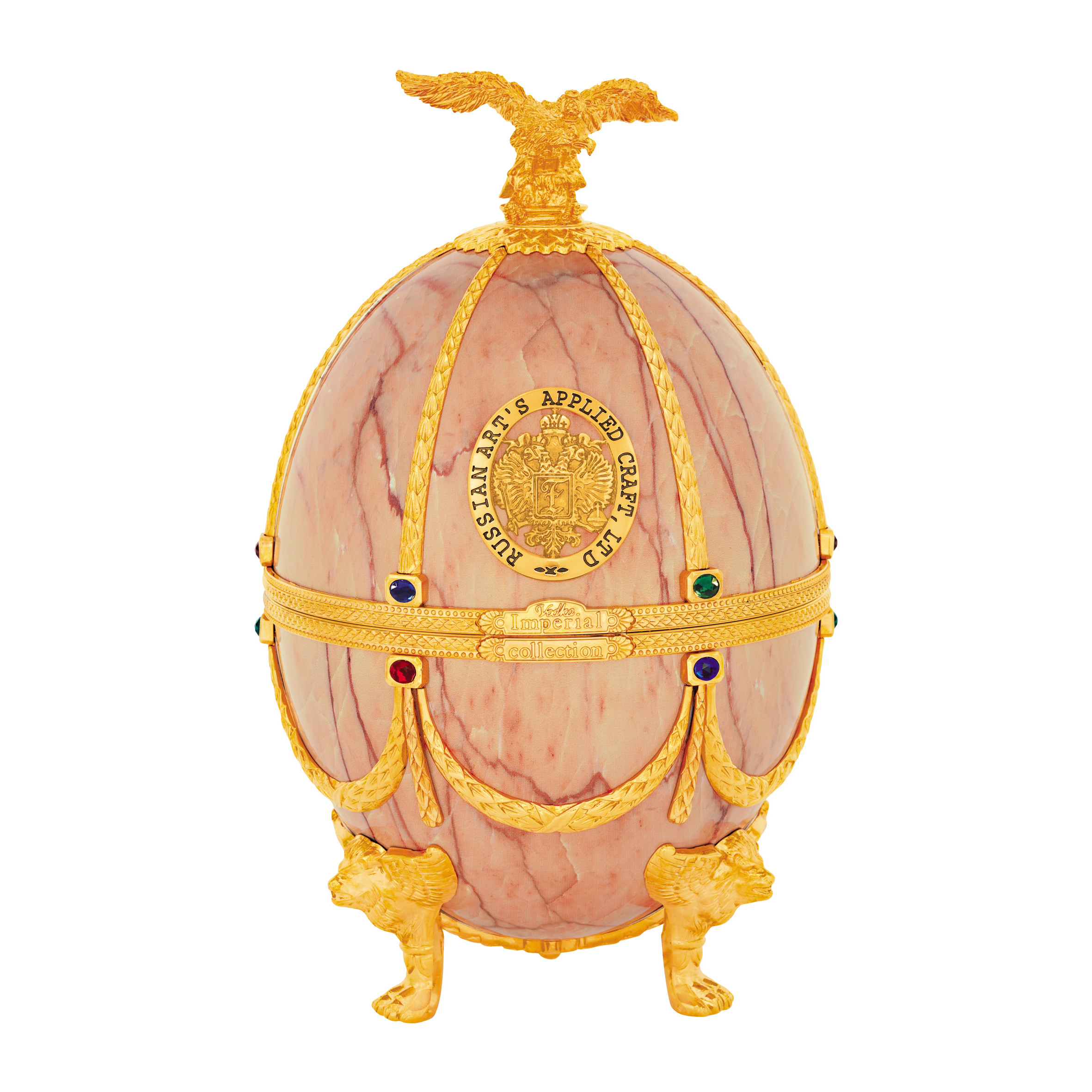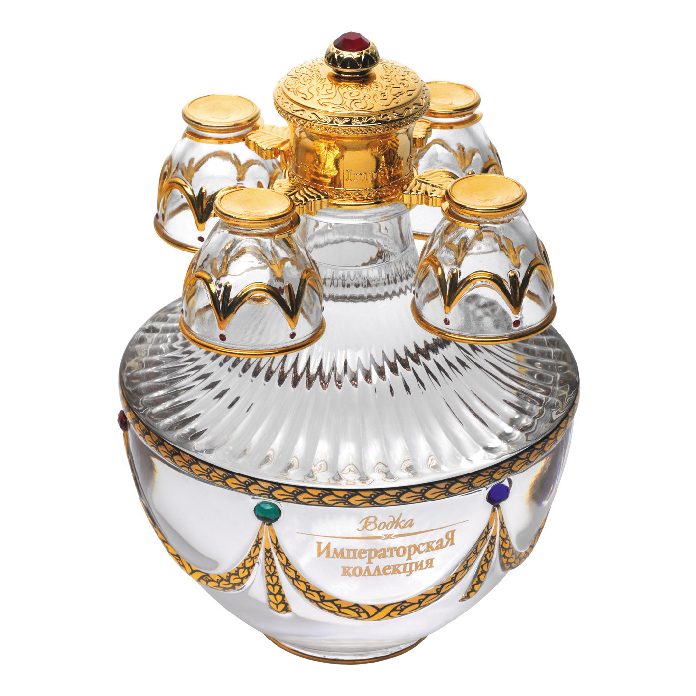 Шедевром бренда «Императорская коллекция» являются уникальные футляры в форме яиц, стилизованных под работы Карла Фаберже. Соединив историческую традицию производства водки и эксклюзивное исполнение, мы создали не просто совершенную водку, а настоящий шедевр ручной работы. Футляр сделан из сплава металла, покрытого эмалью разных цветов и украшенного цветными кристаллами. Завершает композицию орел - изящный и элегантный, разработанный одним из самых известных флорентийских мастеров, который более тридцати лет работает в Ватикане. Графины с рюмками сделаны из венецианского стекла. В подарочный набор «Императорская коллекция Super Premium» входит графин емкостью 0,7 литра с четырьмя рюмочками на кронштейне, футляр в виде пасхального яйца «Фаберже», подарочная коробка, сертификат, подарочный пакет.
