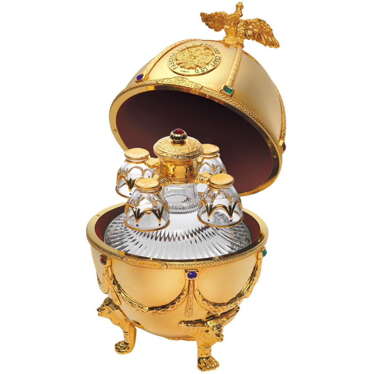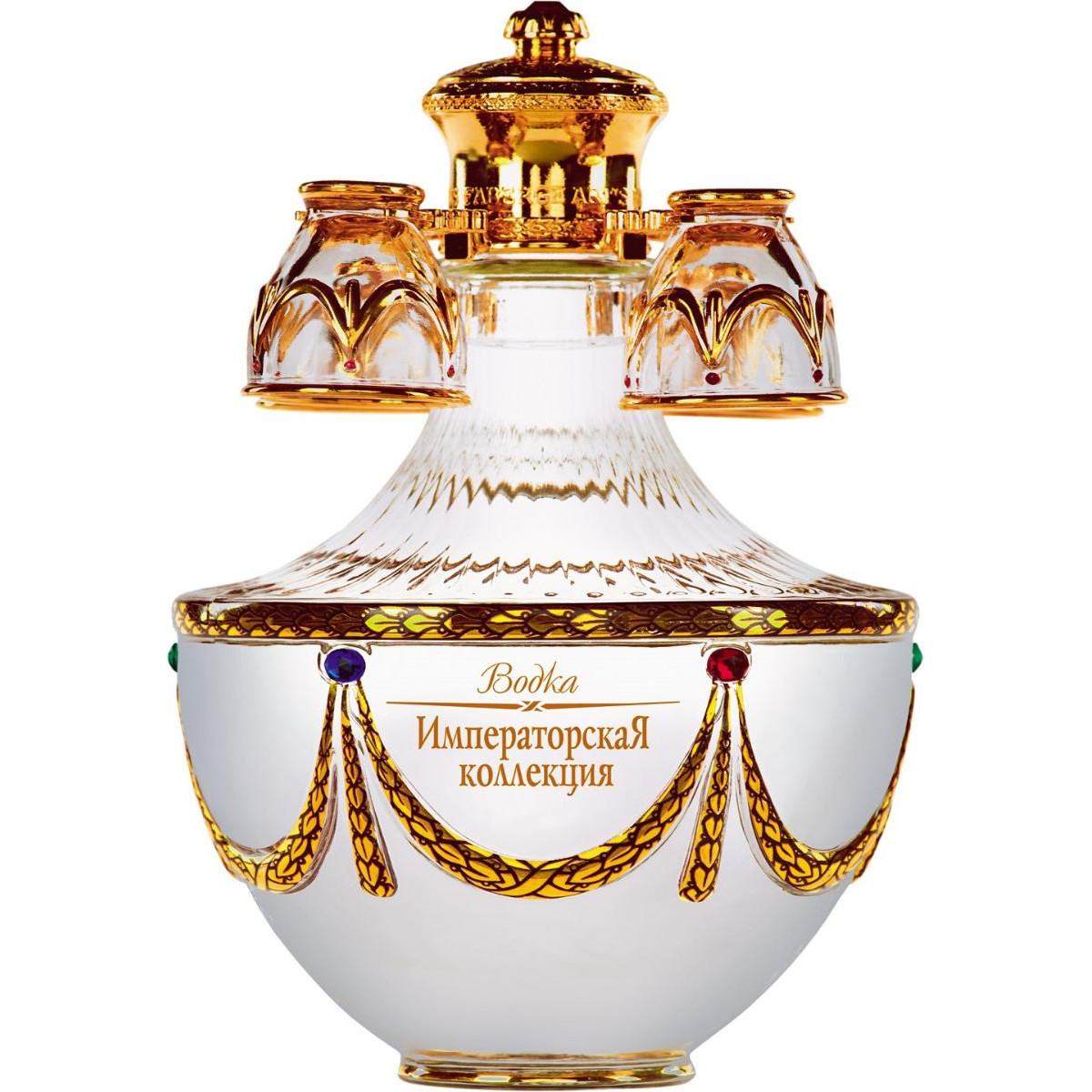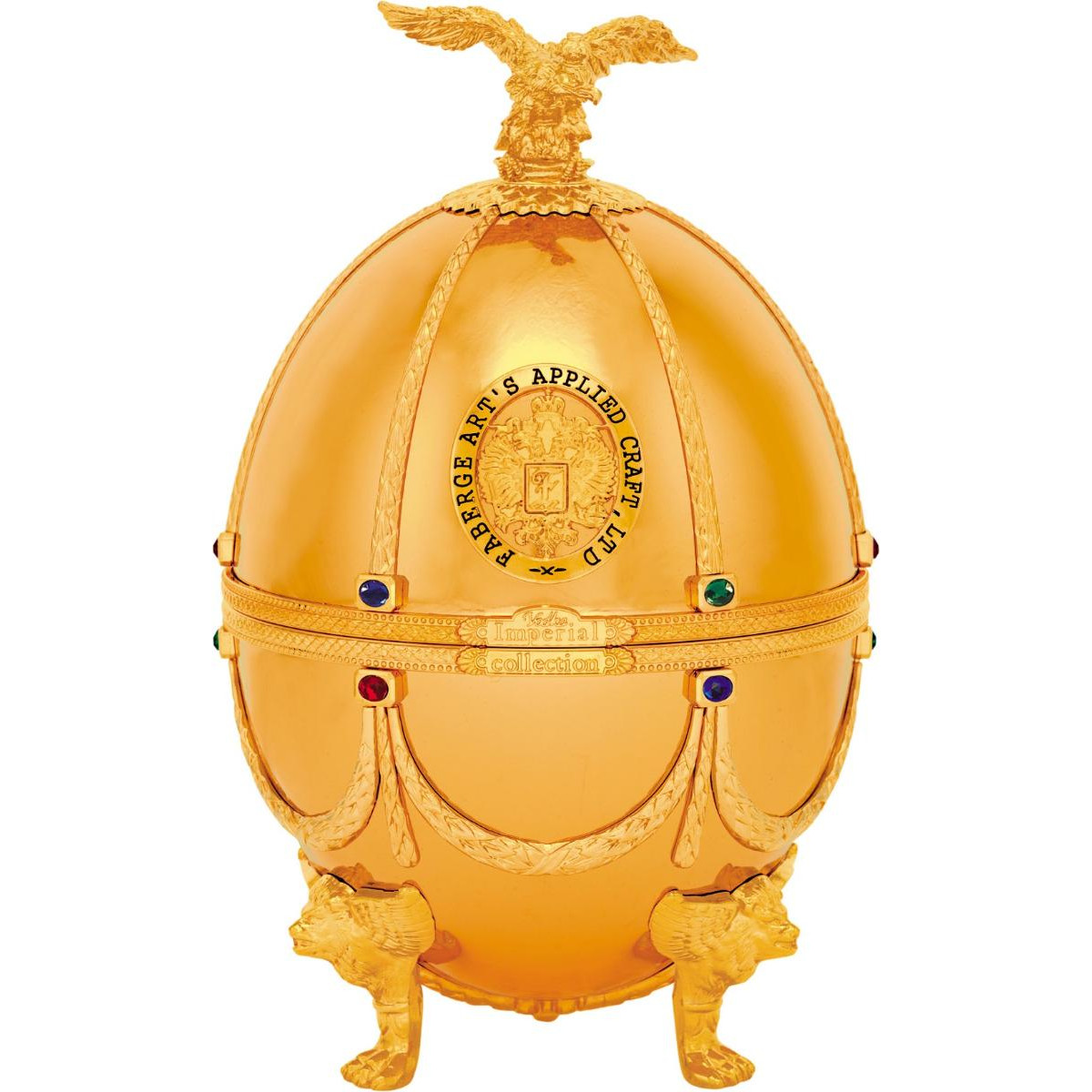Шедевром бренда «Императорская коллекция» являются уникальные футляры в форме яиц, стилизованных под работы Карла Фаберже. Соединив историческую традицию производства водки и эксклюзивное исполнение, мы создали не просто совершенную водку, а настоящий шедевр ручной работы. Футляр сделан из сплава металла, покрытого эмалью разных цветов и украшенного цветными кристаллами. Завершает композицию орел - изящный и элегантный, разработанный одним из самых известных флорентийских мастеров, который более тридцати лет работает в Ватикане. Графины с рюмками сделаны из венецианского стекла. В подарочный набор «Императорская коллекция Super Premium» входит графин емкостью 0,7 литра с четырьмя рюмочками на кронштейне, футляр в виде пасхального яйца «Фаберже», подарочная коробка, сертификат, подарочный пакет.