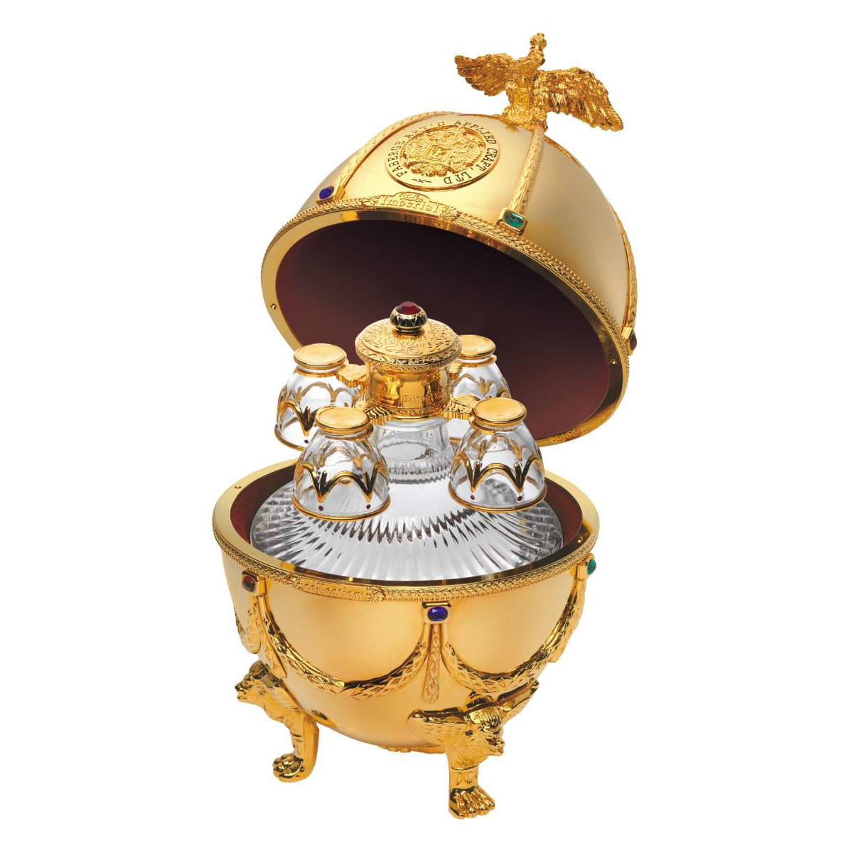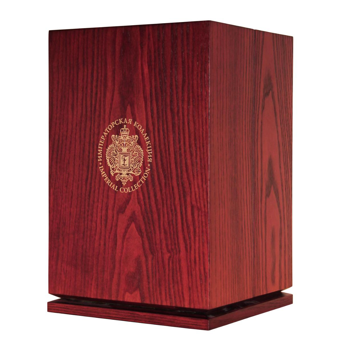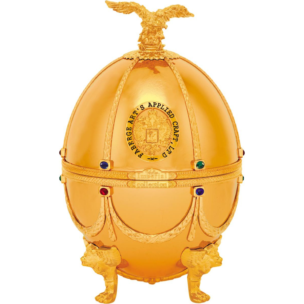 Шедевром бренда «Императорская коллекция» являются уникальные футляры в форме яиц, стилизованных под работы Карла Фаберже. Соединив историческую традицию производства водки и эксклюзивное исполнение, мы создали не просто совершенную водку, а настоящий шедевр ручной работы. Футляр сделан из сплава металла, покрытого эмалью разных цветов и украшенного цветными кристаллами. Завершает композицию орел - изящный и элегантный, разработанный одним из самых известных флорентийских мастеров, который более тридцати лет работает в Ватикане. Графины с рюмками сделаны из венецианского стекла. В подарочный набор «Императорская коллекция Super Premium» входит графин емкостью 0,7 литра с четырьмя рюмочками на кронштейне, футляр в виде пасхального яйца «Фаберже», подарочная коробка, сертификат, подарочный пакет.