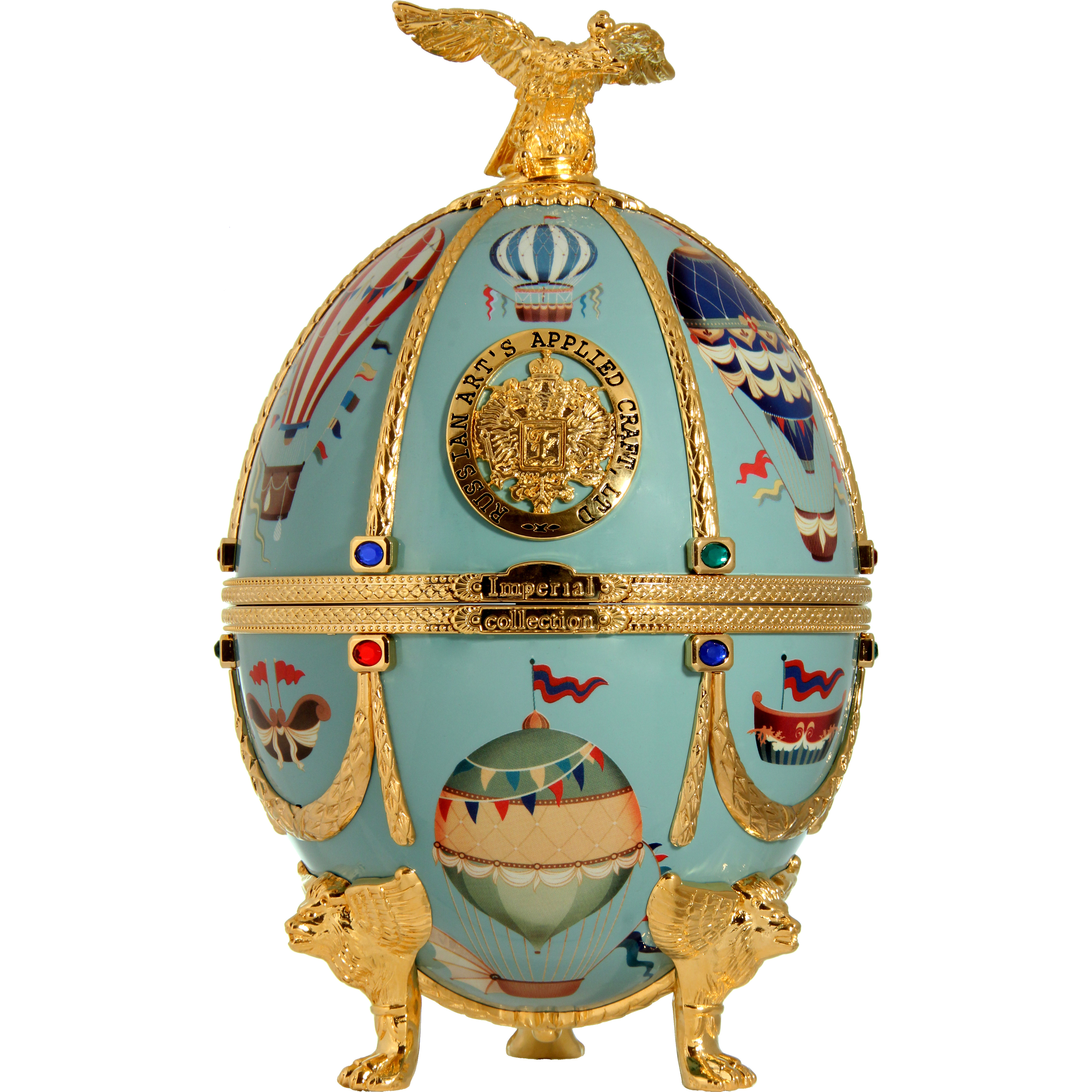 Шедевром бренда «Императорская коллекция» являются уникальные футляры в форме яиц, стилизованных под работы Карла Фаберже. Соединив историческую традицию производства водки и эксклюзивное исполнение, мы создали не просто совершенную водку, а настоящий шедевр ручной работы. Футляр сделан из сплава металла, покрытого эмалью разных цветов и украшенного цветными кристаллами. Завершает композицию орел - изящный и элегантный, разработанный одним из самых известных флорентийских мастеров, который более тридцати лет работает в Ватикане. Графины с рюмками сделаны из венецианского стекла. В подарочный набор «Императорская коллекция Super Premium» входит графин емкостью 0,7 литра с четырьмя рюмочками на кронштейне, футляр в виде пасхального яйца «Фаберже», подарочная коробка, сертификат, подарочный пакет.