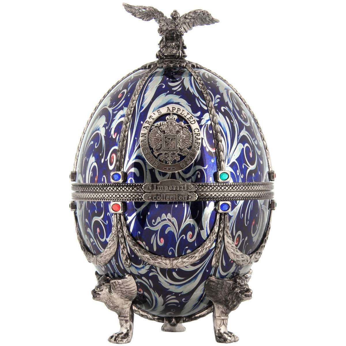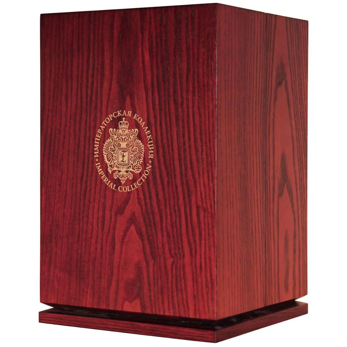 Шедевром бренда «Императорская коллекция» являются уникальные футляры в форме яиц, стилизованных под работы Карла Фаберже. Соединив историческую традицию производства водки и эксклюзивное исполнение, мы создали не просто совершенную водку, а настоящий шедевр ручной работы. Футляр сделан из сплава металла, покрытого эмалью разных цветов и украшенного цветными кристаллами. Завершает композицию орел - изящный и элегантный, разработанный одним из самых известных флорентийских мастеров, который более тридцати лет работает в Ватикане. Графины с рюмками сделаны из венецианского стекла. В подарочный набор «Императорская коллекция Super Premium» входит графин емкостью 0,7 литра с четырьмя рюмочками на кронштейне, футляр в виде пасхального яйца «Фаберже», подарочная коробка, сертификат, подарочный пакет.