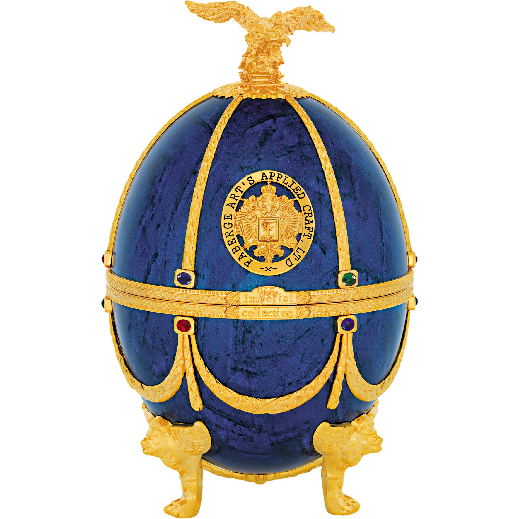 Шедевром бренда «Императорская коллекция» являются уникальные футляры в форме яиц, стилизованных под работы Карла Фаберже. Соединив историческую традицию производства водки и эксклюзивное исполнение, мы создали не просто совершенную водку, а настоящий шедевр ручной работы. Футляр сделан из сплава металла, покрытого эмалью разных цветов и украшенного цветными кристаллами. Завершает композицию орел - изящный и элегантный, разработанный одним из самых известных флорентийских мастеров, который более тридцати лет работает в Ватикане. Графины с рюмками сделаны из венецианского стекла. В подарочный набор «Императорская коллекция Super Premium» входит графин емкостью 0,7 литра с четырьмя рюмочками на кронштейне, футляр в виде пасхального яйца «Фаберже», подарочная коробка, сертификат, подарочный пакет.