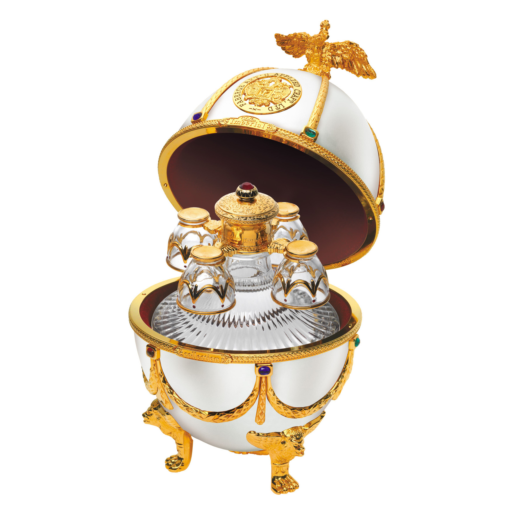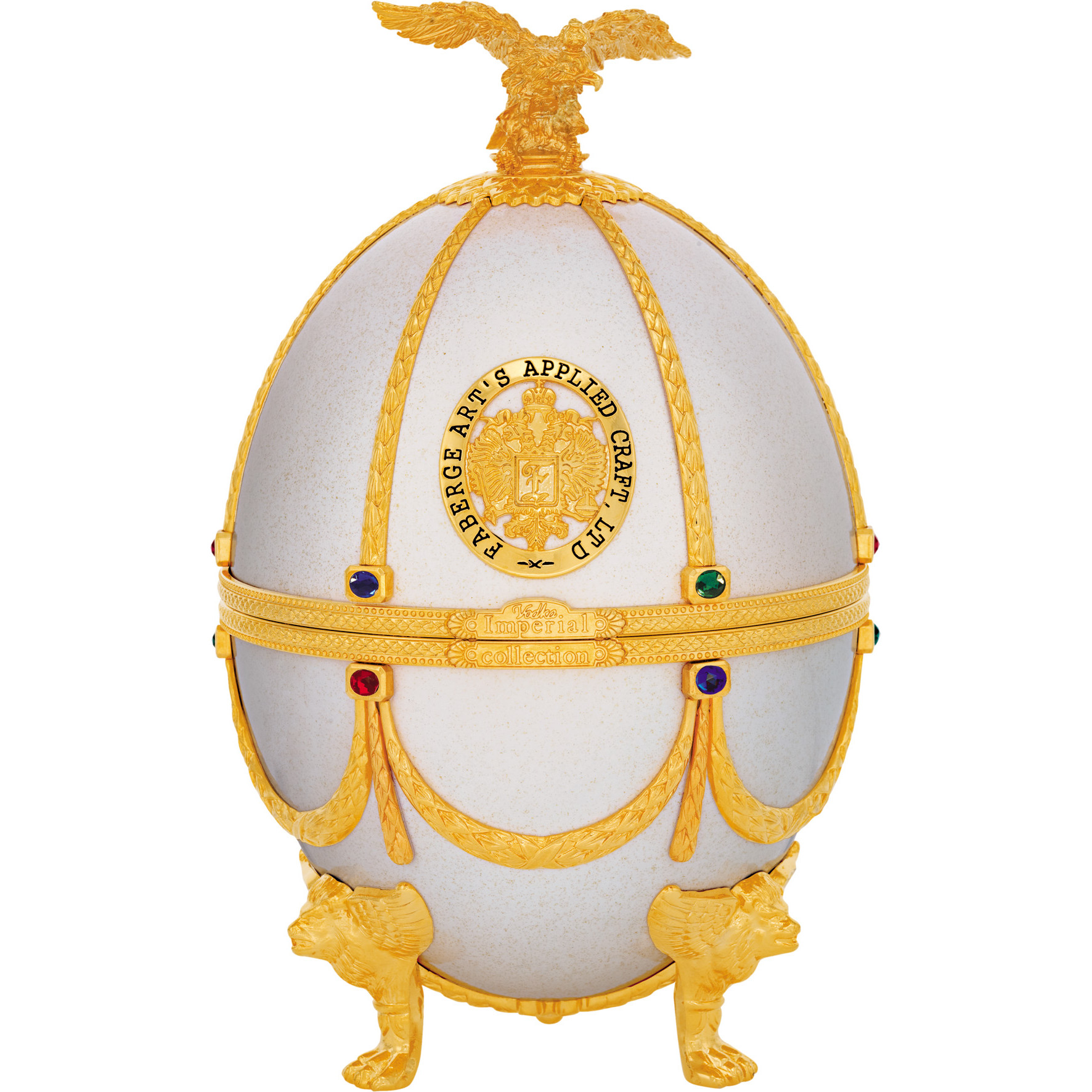 Шедевром бренда «Императорская коллекция» являются уникальные футляры в форме яиц, стилизованных под работы Карла Фаберже. Соединив историческую традицию производства водки и эксклюзивное исполнение, мы создали не просто совершенную водку, а настоящий шедевр ручной работы. Футляр сделан из сплава металла, покрытого эмалью разных цветов и украшенного цветными кристаллами. Завершает композицию орел - изящный и элегантный, разработанный одним из самых известных флорентийских мастеров, который более тридцати лет работает в Ватикане. Графины с рюмками сделаны из венецианского стекла. В подарочный набор «Императорская коллекция Super Premium» входит графин емкостью 0,7 литра с четырьмя рюмочками на кронштейне, футляр в виде пасхального яйца «Фаберже», подарочная коробка, сертификат, подарочный пакет.