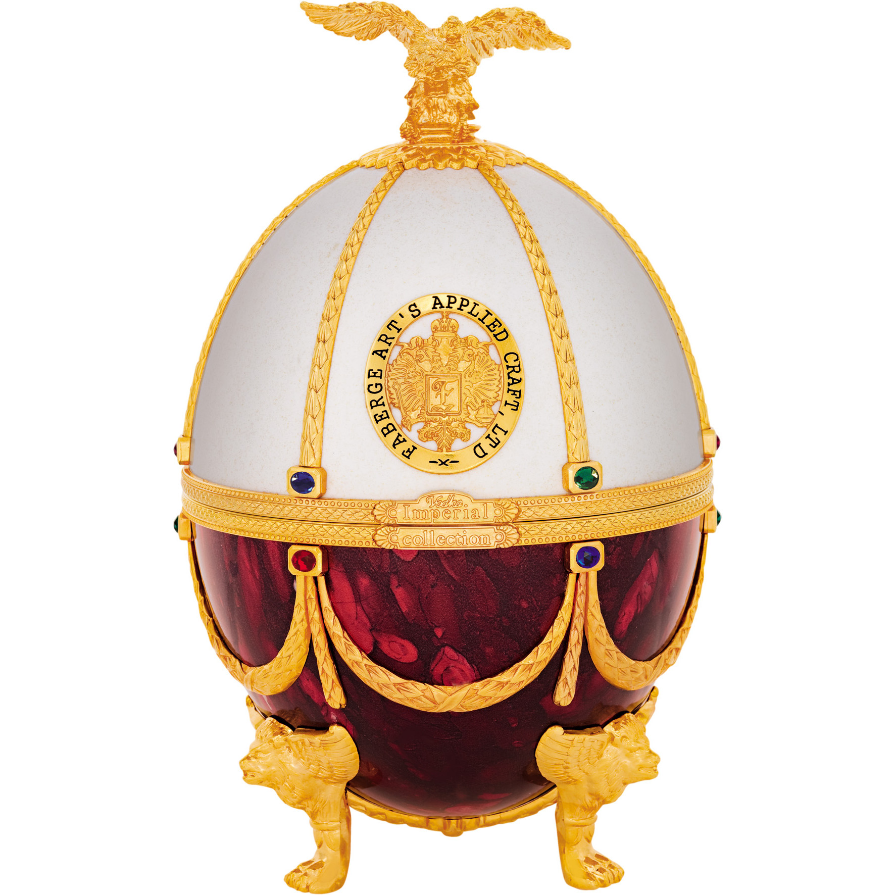 Шедевром бренда «Императорская коллекция» являются уникальные футляры в форме яиц, стилизованных под работы Карла Фаберже. Соединив историческую традицию производства водки и эксклюзивное исполнение, мы создали не просто совершенную водку, а настоящий шедевр ручной работы. Футляр сделан из сплава металла, покрытого эмалью разных цветов и украшенного цветными кристаллами. Завершает композицию орел - изящный и элегантный, разработанный одним из самых известных флорентийских мастеров, который более тридцати лет работает в Ватикане. Графины с рюмками сделаны из венецианского стекла. В подарочный набор «Императорская коллекция Super Premium» входит графин емкостью 0,7 литра с четырьмя рюмочками на кронштейне, футляр в виде пасхального яйца «Фаберже», подарочная коробка, сертификат, подарочный пакет.