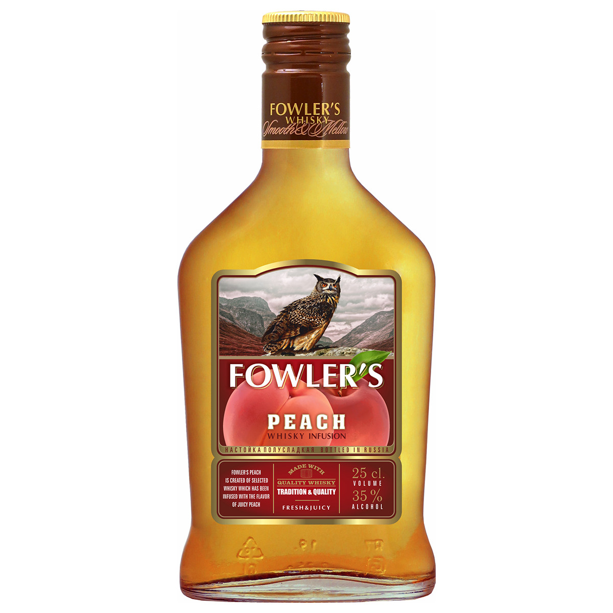 Fowler’s Peach производится по авторскому рецепту купажа 5ти-летнего виски Fowler’s с добавлением натурального персикового морса. Fowler’s Peach идеален и для шумных коктейльных вечеринок, и для теплых тихих вечеров. www.fowlers.ru