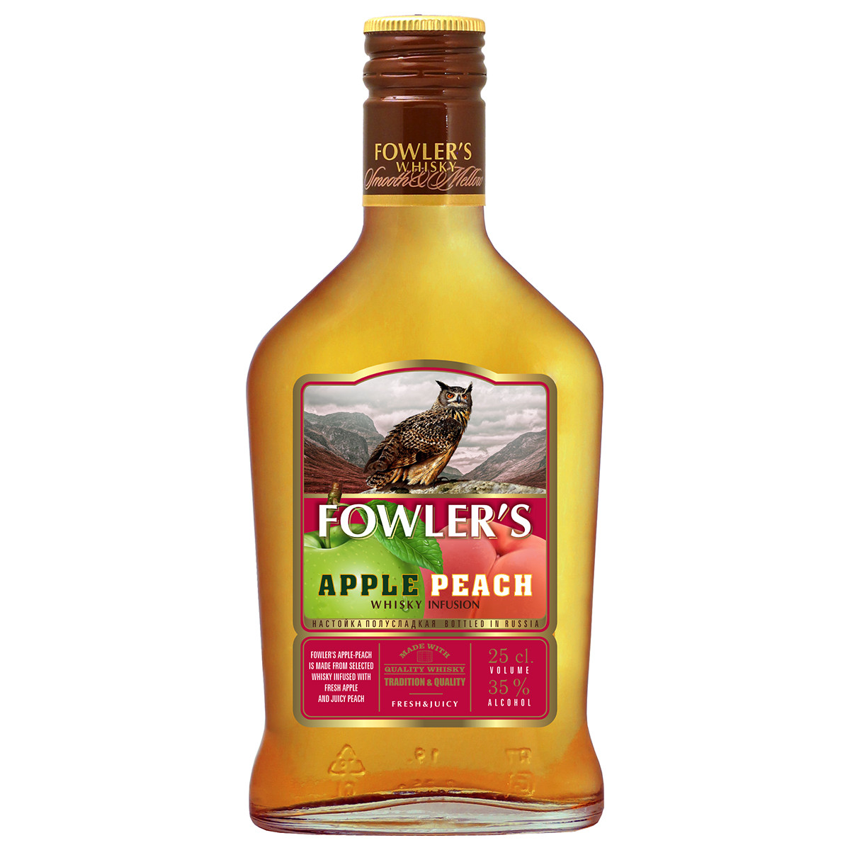 Идеальное сочетание двух вкусов. Мягкий и освежающий, сочный и ароматный – именно таким ярким и необычным вкусом обладает виски Fowler’s Apple-Peach, в составе которого натуральный яблочный морс и настой персика. А поскольку основным его компонентом остается виски, Fowler’s Apple-Peach идеально подойдет как поклонникам виски, так и тем, кто ищет новый освежающий вариант коктейля.
