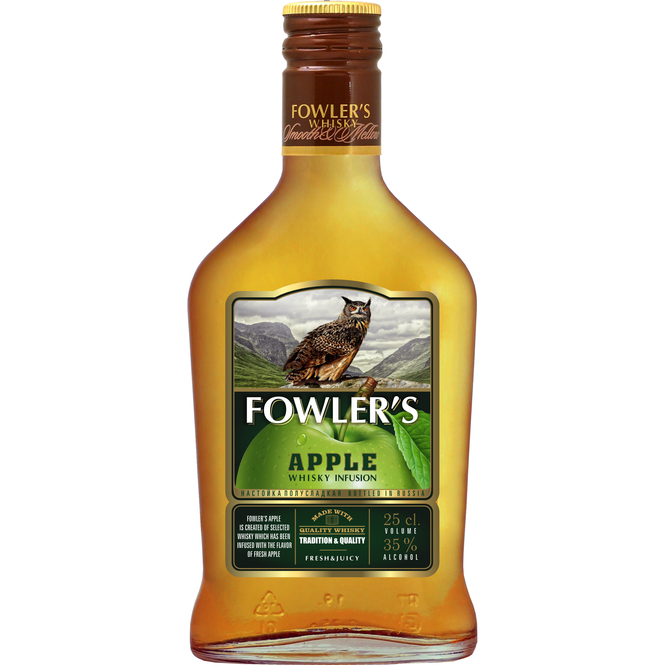 На удивление мягкий и освежающий, сочный и ароматный – именно таким ярким и необычным вкусом обладает виски Fowler’s Apple. В составе – натуральный яблочный морс. А поскольку основным его компонентом остается виски, Fowler’s Apple идеально подойдет как поклонникам виски, так и тем, кто ищет новый освежающий вариант коктейля. www.fowlers.ru