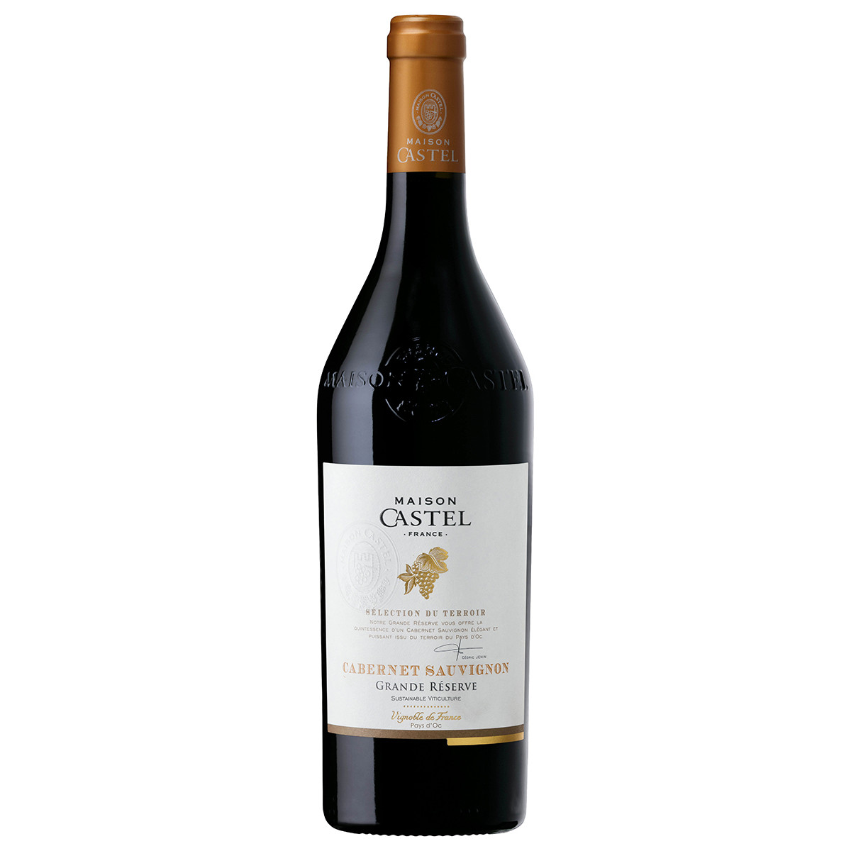 Получившее статус защищенного географического указания Pays d'Oc, вино Cabernet-Sauvignon Grande Réserve от Maison Castel является плодом тщательного отбора винограда с нескольких участков в регионе Лангедок-Руссильон, расположенном на юге Франции, на берегу Средиземного моря. Этот регион обладает благоприятным климатом, солнечными днями и прохладными ночами, что способствует полному созреванию винограда и сохранению его ароматики. Лозы растут на глинисто-известняковых почвах, которые обеспечивают винограду равномерное питание и водоснабжение. Статус защищенного географического указания (IGP) Pays d’Oc гарантирует вину происхождение, качество и типичность. Вино выдерживалось в новых дубовых бочках в течение 3-х месяцев.