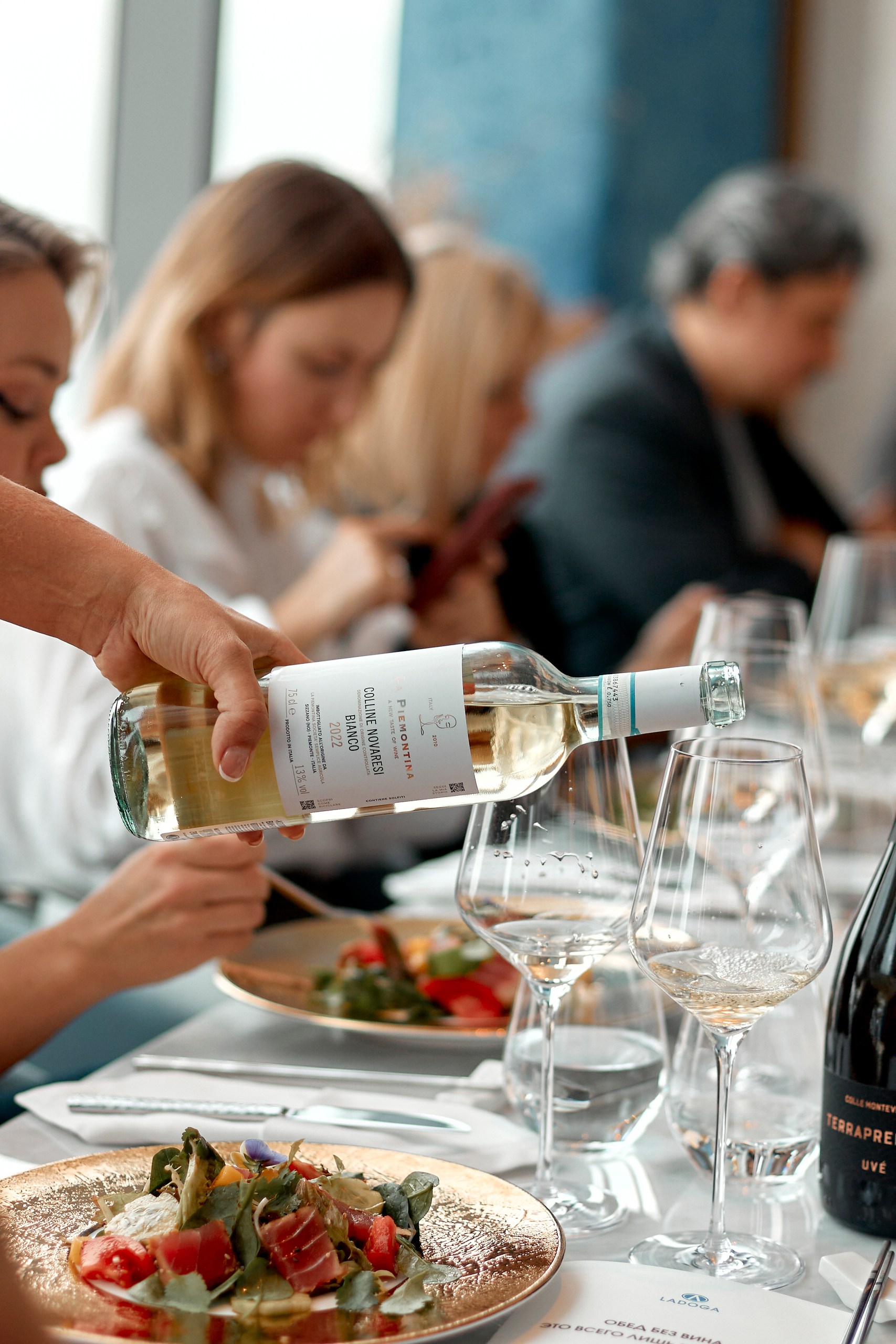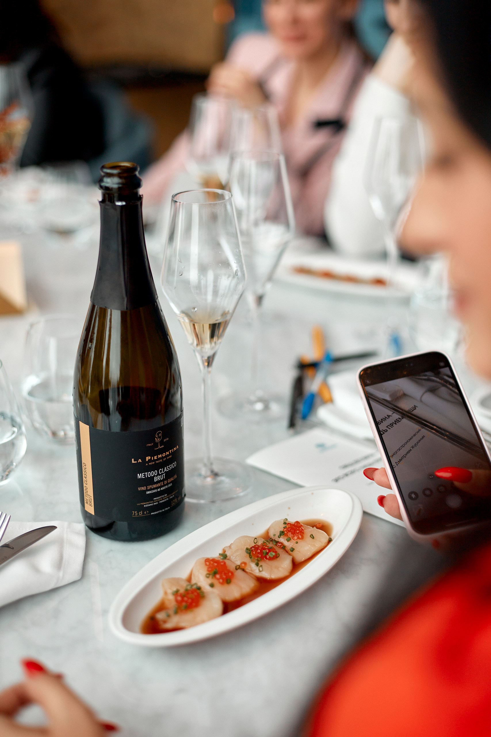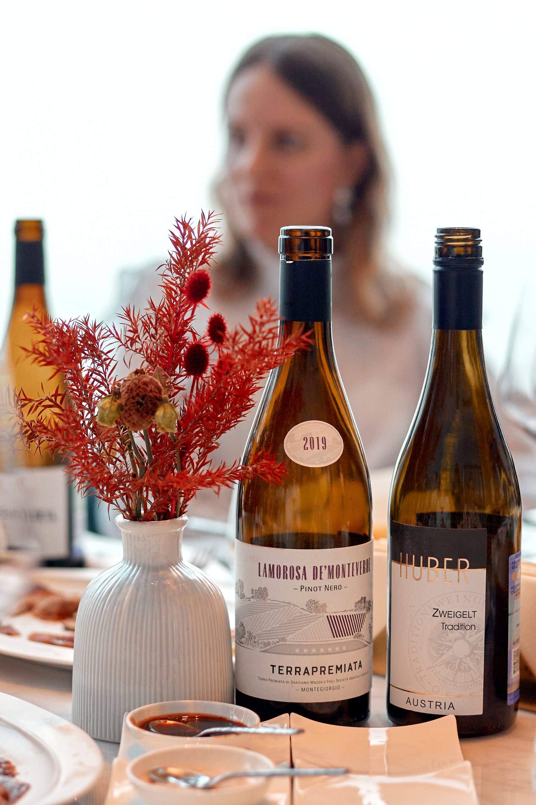 Обед начали с игристого по традиционному методу из автохтонного пьемонтского сорта винограда Эрбалуче от молодой винодельни из Северного Пьемонта – La Piemontina – и продолжили тихим Colline Novaresi Bianco из Эрбалуче от того же производителя. Также гостям были представлены тихое и игристое TerraPremiata (от тех самых производителей бренда модных кроссовок Premiata, одинаково превосходно создающих и обувь, и вина), Алиготе из Бургундии Les Fortunés с глинисто-известняковых почв апелласьона Кот Шалонез от производителя Maison Chanzy, Каберне Фран из французского апелласьона Бургёй Cote 50 от Yannick Amirault и бордоский ассамбляж с добавлением Сенсо от знаменитой ливанской винодельни Château Kefraya. К говяжьей вырезке с картофелем гостям предложили красное сухое Château Haute-Nauve Saint-Émilion Grand Cru 2019 года из Сент-Эмильона. Одной из самых ярких гастропар дня стал австрийский Рислинг Ried Rothenbart 2022 года с отдельного виноградника от Markus Huber в сочетании с салатом с тунцом аками на листьях шпината.